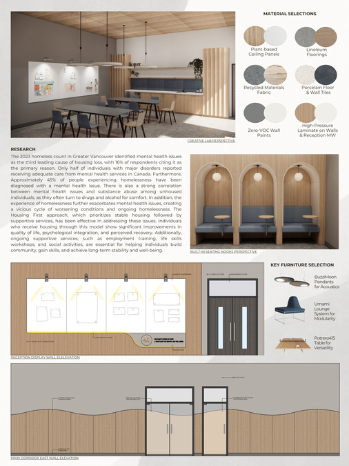 Wings of Hope is a dedicated center located in Vancouver, BC, designed to support unhoused individuals struggling with mental health issues. The center integrates healthcare, community support, and transitional services. The design reflects the transformative journey of swans, symbolizing resilience and change. Key spaces include a reception area, therapy/quiet room, conference room, and flexible creative lab, all aimed at fostering a sense of community and stability. The project emphasizes the Housing First model, providing immediate referral to stable housing and ongoing support to break the cycle of homelessness and promote long-term well-being.