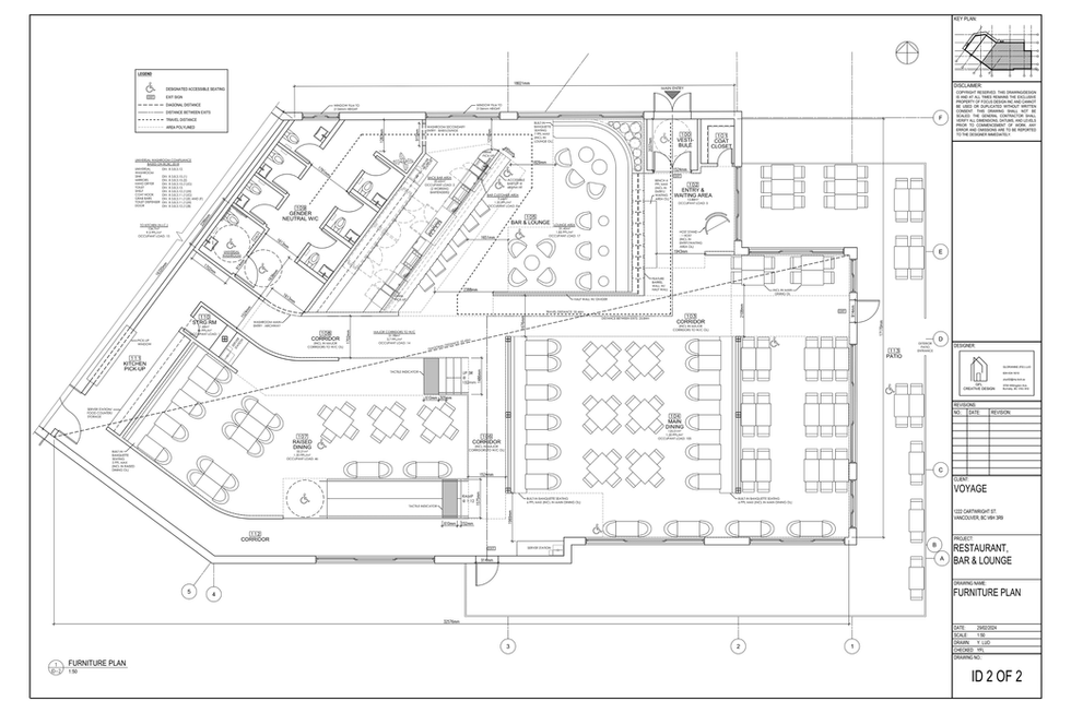 Voyage is a restaurant and bar concept on Granville Island, Vancouver. The design draws inspiration from the spirit of ancient maritime explorers, weaving elements of the sea into the modern dining experience. With seating for approximately 130 in the restaurant, the space features a blend of casual-upscale dining, local fresh seafood, and West Coast flavours. The design integrates warm, natural materials such as wood, stone, and rope to evoke the feel of the ship's interior, while the layout ensures barrier-free access and a seamless flow between the dining areas, bar, and outdoor patio.